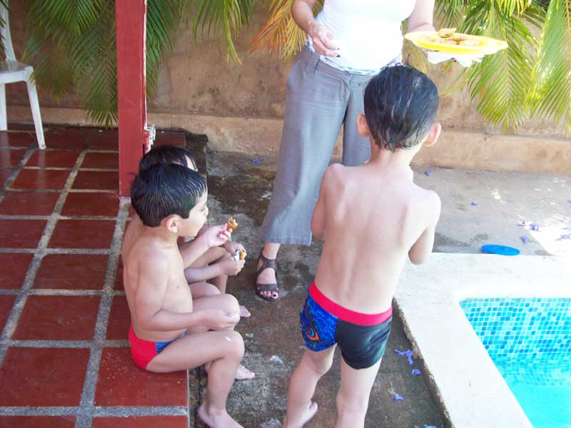 La piscinada que se ofrecía en la invitación que nos hiciera Liliana y Antonio merece una mención aparte y muy particular, que a su vez me hace retomar mis escarceos con el sol. Daba gusto ver cómo los chipilines, bajo el ojo visor de sus respectivos padres alrededor, disfrutaban de las zambullidas y de los juegos típicos que suelen ocurrírsele a todo aquel que se le permite andar en paños menores y con el agua hasta la cintura. Estoy seguro que a ninguno de ellos le pasó por la cabeza la incandescencia del catirito… simplemente estaban disfrutando de una fresca, muy fresca tarde marabina…